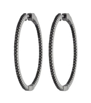 Les grands anneaux en zircon noir de haute qualité sont réalisés en argent 925 recouvert d'une finition noire. Leur diamètre extérieur est de 45mm. Ces anneaux possèdent également un mécanisme de sécurité d'ouverture par un bouton-pression.