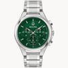 Conjuguant une incomparable finesse à la technologie de pointe de Bulova, cette nouvelle montre à 5 aiguilles pour hommes de Bulova réoriente l’avant-gardiste collection CURV. Dotées du premier mouvement incurvé conçu au monde, les montres de la collection CURV utilisent une technologie à quartz de haute performance de 262 kHz, laquelle offre une précision remarquable de 5 secondes par mois. Ce nouveau modèle CURV se distingue par son boîtier en acier inoxydable argenté agrémenté d’accents polis et brossés surmonté d’un verre en saphir galbé. Ajouré, le cadran vert vif à rayures donne un aperçu du mouvement complexe. Doté de marqueurs argentés en acier inoxydable et d’aiguilles qui contrastent avec l’arrière‑plan, le cadran comporte trois sous‑cadrans qui affichent le temps écoulé selon des intervalles de 12 heures, de 60 minutes et de 60 secondes. Le sous‑cadran à la position 6 h fait office de chronomètre de 60 secondes et de trotteuse. Le poussoir situé à la position 4 heures active l’affichage de deux fuseaux horaires. Dotée d’un bracelet assorti en acier inoxydable argent, cette montre s’attache à l’aide d’un fermoir déployant muni de boutons‑poussoirs. Redéfinissant le profil raffiné du premier modèle de la collection CURV, cette nouvelle montre de Bulova présente une esthétique soignée qui va de pair avec un mode de vie chic.