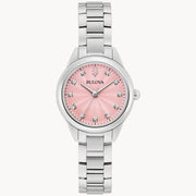 Ajoutez une touche de couleur à vos tenues grâce à cette élégante montre pour femmes de la collection Sutton de Bulova. Son boîtier argenté en acier inoxydable présente un fini magistral brossé et poli, avec un verre à saphir bombé pour une clarté idéale. Le cadran rayonnant rose pastel d’élégante simplicité, présente 11 marqueurs en diamant éblouissants, des aiguilles fines et le logo du diapason à la position 12 h. La montre est dotée d’un bracelet assorti en acier inoxydable à trois maillons avec fermoir déployant. Faites preuve d’audace avec cette petite montre pour femmes de Bulova.