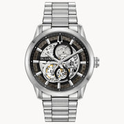 Modèle sophistiqué doté d’un cadran et d’un fond de boîtier entièrement transparents. Boîtier vissé en acier inoxydable, cadran ouvert noir à trois aiguilles révélant les rouages complexes du mouvement à remontage automatique à 21 rubis, verre minéral bombé, bracelet en acier inoxydable avec fermoir déployant à bouton-poussoir, et étanchéité jusqu’à 30 mètres.