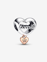 Affichez votre affection pour les personnes les plus chères de votre vie avec le Charm Cœur « Love You Family ». Fabriqué d’argent sterling, ce modèle en forme de cœur porte le mot « Family » en tracé ajouré des deux côtés. Un petit pendentif en forme de cœur plaqué or rose 14 K ajoute une touche sincère, avec les mots « Love you » gravés des deux côtés. Un magnifique cadeau à offrir à un membre de votre famille ou un symbole significatif à porter sur vos propres bijoux pour garder vos proches près de votre cœur.