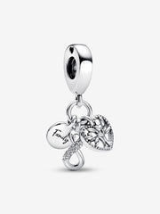 La famille arrive en premier, deuxième et troisième position dans ce charm-pendentif triple. Fabriqué d’argent sterling, le Charm-pendentif triple Infini Famille présente un arbre généalogique à l’intérieur d’un cœur ajouré et un signe d’infini décoré de pavé scintillant; trois puissants symboles de proximité et d’amour éternel dans un seul bijou. Portez ce charm pour garder vos proches près de vous où que vous alliez.