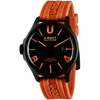 VERRE: Saphir bombé de haute qualité RÉSISTANCE À L'EAU: 50 mètres, 5 ATM BRACELET: Bracelet en silicone ultra résistant, de couleur orange, personnalisé avec le logo de la Maison en relief. Largeur 22/20 mm. Bracelet : réf. 9535/Z. Boucle à ardillon en acier avec traitement PVD ultérieur. Boucle : réf. 5467 - MAT - VIS
