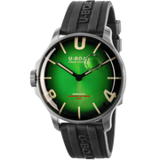 Une collection inspirée par le côté obscur de la lune. Le boîtier est entièrement rempli d'une huile spéciale qui met en valeur le cadran, fabriqué en métal vert avec une finition soleil, créant un effet optique d'une couleur plus intense et d'une lisibilité accrue. Système de verrouillage innovant (système de verrouillage par bague) avec remplacement rapide de la pile.