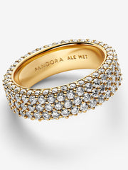 Maximisez votre scintillement avec notre Bague en pavé à trois rangs Pandora Timeless finie à la main. Fabriqué en plaqué or 14k, cette bague remarquable présente trois rangées de zircones cubiques incolores autour du centre et d’une rangée orientée vers l’extérieur de chaque côté, créant ainsi un profil carré un peu arrondi qui brille sous tous les angles. Portez-la seule ou superposée à d’autres bagues en pavé Timeless pour créer un look aussi audacieux que vous le souhaitez.