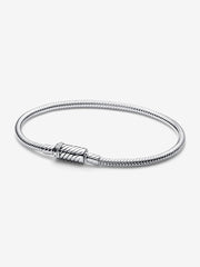 Découbrez le Bracelet à chaîne serpentine et à fermoir coulissant magnétique Pandora Moments Notre bracelet à chaîne serpentine en argent sterling est mis à jour avec un nouveau fermoir magnétique, ce qui le rend encore plus facile à enfiler et à agencer avec vos charms préférés. Le fermoir magnétique se ferme facilement et un manchon coulissant le maintient fermement en place. La texture de la chaîne serpentine se poursuit sur le fermoir pour un look épuré et élégant. Agencez-le avec un maximum de 16 à 18 charms ou charms-pendentifs.
