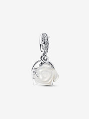 Adoptez l’élégance avec le Charm-pendentif double Rose blanche en fleur, une pièce en argent sterling chargée d’amour et de symbolisme. Ce charm complexe est orné d’une rose en nacre synthétique blanche en biorésine, dont les pétales superposés capturent l’essence d’une fleur qui fleurie. Orné de zircones cubiques incolores, ce charm est un témoignage scintillant à l’amour. Le message gravé « NOTHING COMPARES TO YOU » (RIEN NE SE COMPARE À TOI) ajoute une touche personnelle. Les détails soignés, de l’anneau épineux aux disques en forme de feuille, font de ce charm Pandora Moments à offrir un symbole éternel d’amour pur.