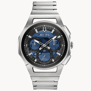 Issue de la collection CURV. Le premier mouvement de chronographe incurvé au monde est doté d’une technologie à quartz de haute performance avec une fréquence de vibration de 262 kHz offrant une précision accrue. Chronographe à cinq aiguilles étanche jusqu’à 30 mètres, dans un boîtier en acier inoxydable, doté d’un cadran bleu foncé avec des aiguilles et des marqueurs argent, d’un fond de boîtier transparent, d’un verre saphir incurvé antireflet, d’un boîtier vissé, et d’un bracelet en acier inoxydable avec fermoir déployant à double pression.