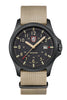 Cette montre Atacama Field 1970 s'inspire de son homonyme, le désert d'Atacama. Le design avec un cadran vert foncé avec une finition texturée et des chiffres d'heure en sable évoque le terrain et le paysage accidenté du désert. La montre présente un grand cadran qui affiche l'horloge sur 12 et 24 heures, ainsi qu'une trotteuse à pointe rouge et une flèche rouge à côté de la date à 3 heures pour une lisibilité instantanée. Le cadran est protégé par une glace saphir avec revêtement antireflet. Le boîtier CARBONOX™ de 43 mm est assorti à un bracelet en caoutchouc noir.