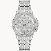 Faites sensation en portant l’élégante montre Octava de taille moyenne issue de la collection Crystal de Bulova. Le boîtier en acier inoxydable argenté s’harmonise avec le superbe cadran entièrement en pavé blanc‑argenté à trois aiguilles, tandis que les 345 cristaux sertis à la main sur la montre lui confèrent un style chic. Le bracelet argenté en acier inoxydable s’attache aisément au moyen d’un fermoir déployant doté de boutons‑poussoirs. Cette montre à l’allure distinguée agrémente toute tenue de jour et de soirée.